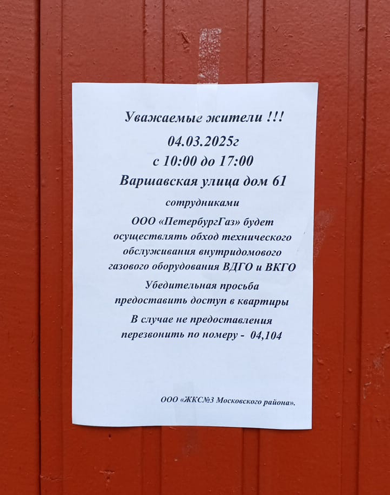 Информирование собственников о проверке внутридомового и внутриквартирного газового оборудования представителями ООО "ПетербургГаз" с 10:00 до 17:00 04.03.2025 г. по адресу: Варшавская улица, д. 61
