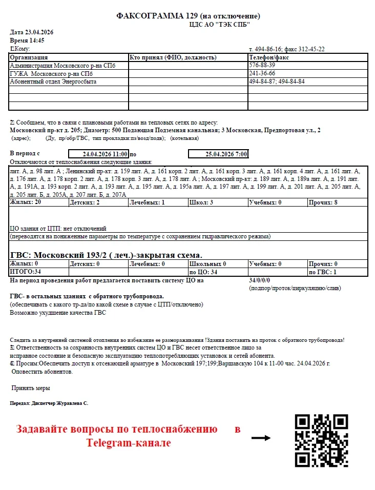 ЦДС АО "ТЭК СПБ" информирует об отключении теплоснабжения c 11:00 24.04.2026 г. по 07:00 25.04.2026 г. в связи с ремонтными работами на тепловой сети по адресу: Московский пр., д. 205