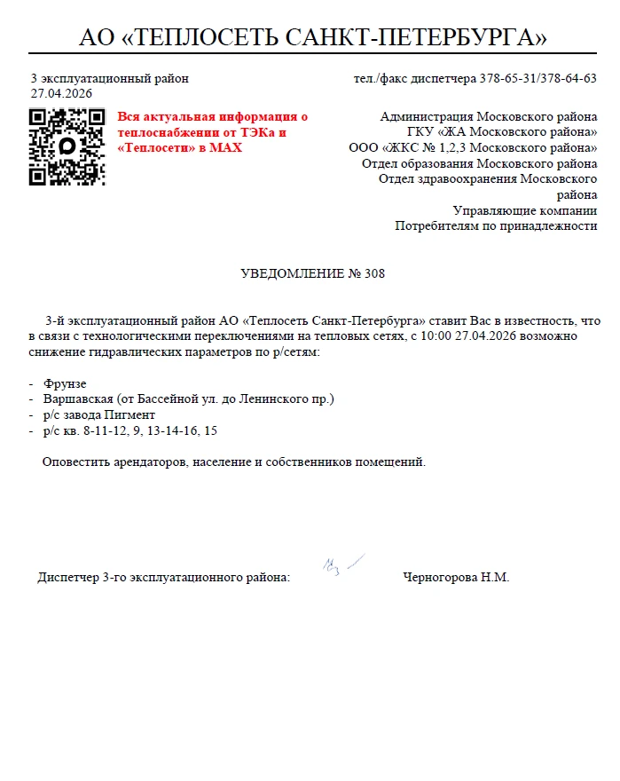3-й эксплуатационный район АО «Теплосеть Санкт-Петербурга» ставит Вас в известность, что в связи с технологическими переключениями на тепловых сетях, с 10:00 27.04.2026 возможно снижение гидравлических параметров по р/сетям: