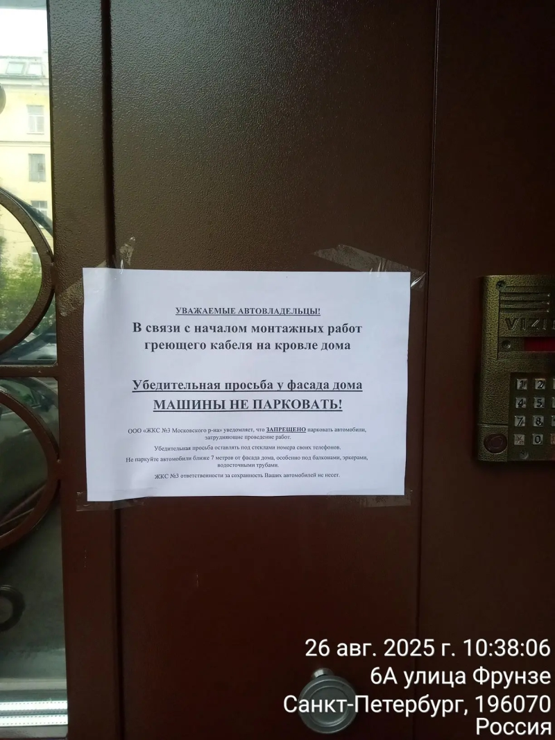 Информирование собственников о начале монтажных работ по установке греющего кабеля на кровле многоквартирного дома по адресу: улица Фрунзе, д. 6, лит. А, парадные №2, №3, №4.