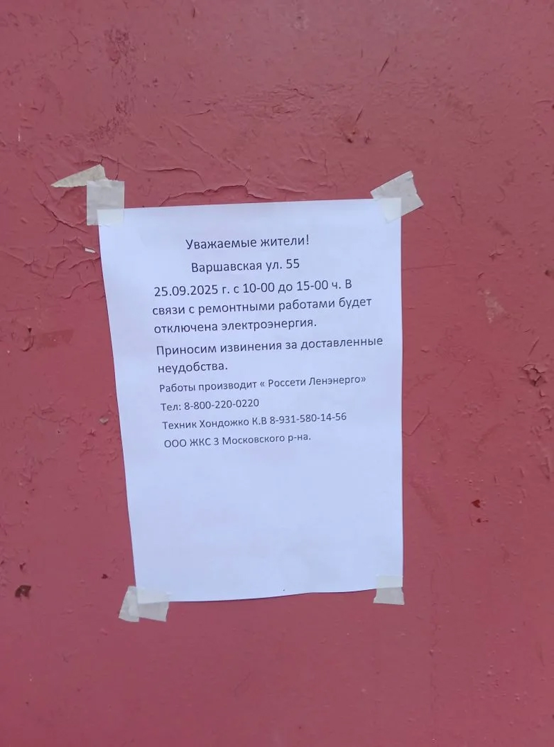Информирование собственников о прекращении подачи электроэнергии с 10:00 до 15:00 24.09.2025 г. в связи с ремонтными работами по адресу: Варшавская улица, д. 55