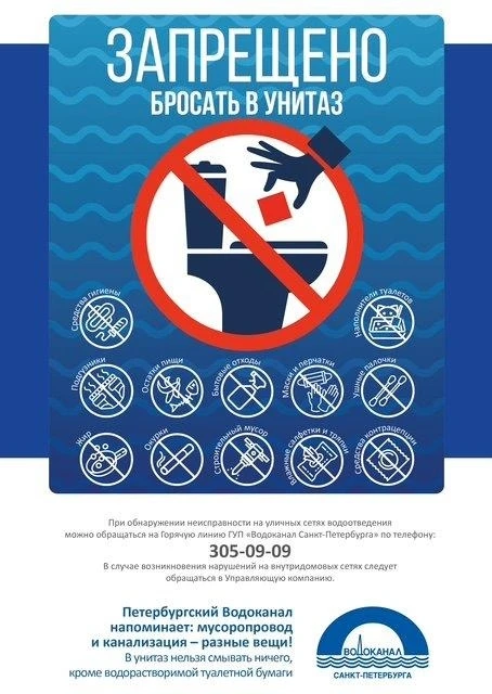 ГУП "ВОДОКАНАЛ САНКТ-ПЕТЕРБУРГА" напоминает о недопустимости сброса посторонних предметов и веществ (тряпок, нерастворимого жира, предметов личной гигиены), запрещенных к сбросу в систему коммунальной канализации. В период с 16.02.2026 г. по 16.03.2026 г. бригадами Предприятия в ходе выполнения заявок на засоры дворовой канализации по 9 адресам из трубопроводов извлечены посторонние предметы, в том числе обильные скопления тряпок и жировых масс.