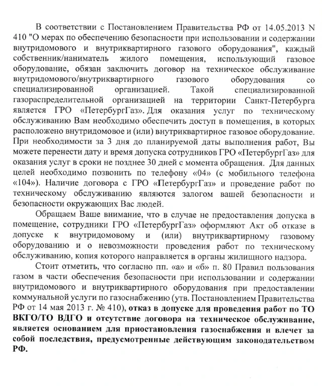 В соответствии с Постановлением Правительства РФ от 14.05.2013 N 410 "О мерах по обеспечению безопасности при использовании и содержании внутридомового и внутриквартирного газового оборудования", каждый собственник/наниматель жилого помещения, использующий газовое оборудование, обязан заключить договор на техническое обслуживание внутридомового/внутриквартирного газового оборудования со специализированной организацией. Такой специализированной газораспределительной организацией на территории Санкт-Петербурга является ГРО «ПетербургГаз». Для оказания услуг по техническому обслуживанию Вам необходимо обеспечить доступ в помещения, в которых расположено внутридомовое и (или) внутриквартирное газовое оборудование. При необходимости за 3 дня до планируемой даты выполнения работ, Вы можете перенести дату и время допуска сотрудников ГРО «ПетербургГаз» для оказания услуг в сроки не позднее 30 дней с момента обращения. Для данных целей необходимо позвонить по телефону «04» (с мобильного телефона «104»). Наличие договора с ГРО «ПетербургГаз» и проведение работ по техническому обслуживанию являются залогом вашей безопасности и безопасности окружающих Вас людей.