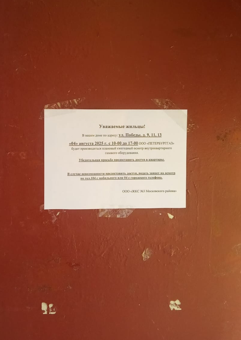 Информирование собственников о необходимости предоставления доступа для проверки внутриквартирного газового оборудования представителям АО "Ленпромгаз" с 10:00 до 17:00 04.08.2025 г. по адресам: улица Победы, д. 9, д. 11, д. 13