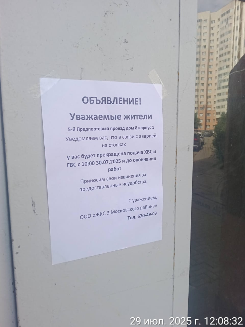 Информирование собственников об отключении ХВС и ГВС с 10:00 30.07.2025 г. в связи с аварией на стояках по адресу: 5-й Предпортовый проезд, д. 8, к. 1