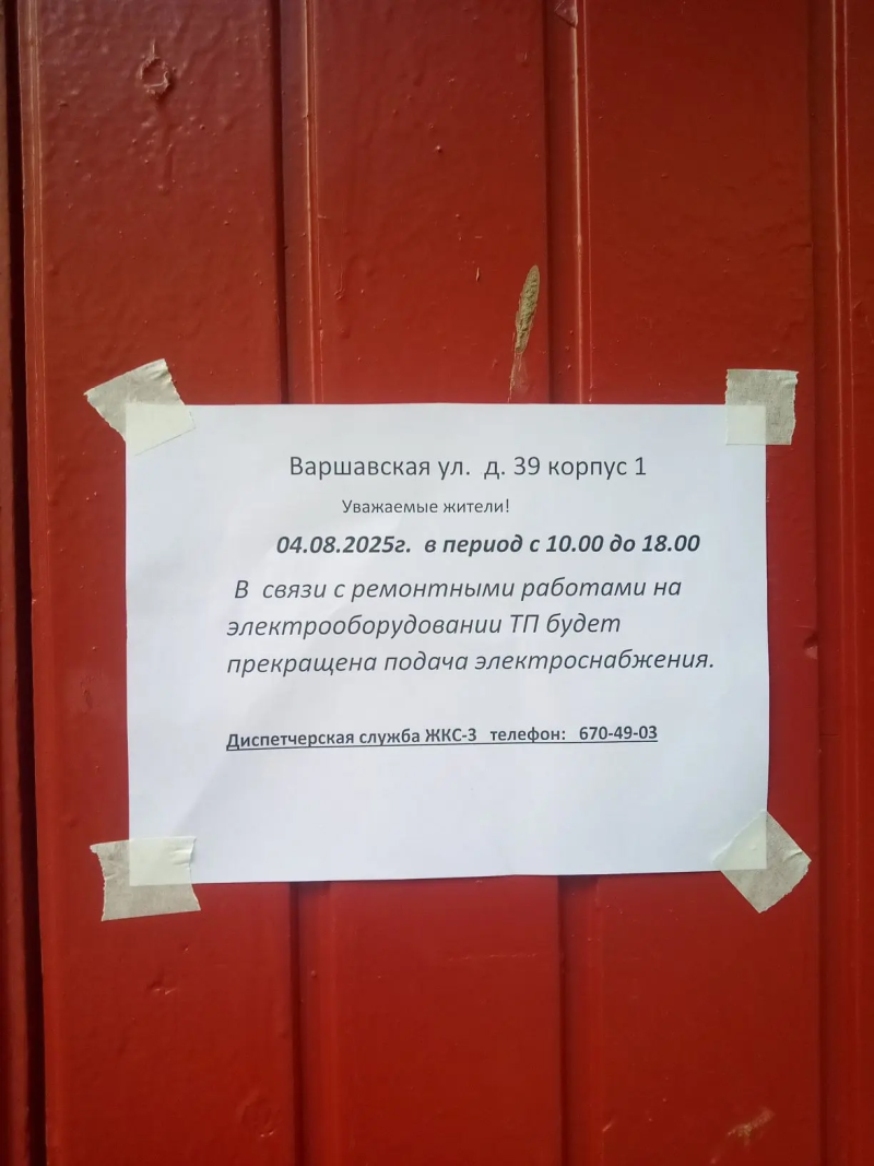 Информирует собственников о прекращении подачи электроэнергии в связи с проведением ремонтных работ с 10:00 до 18:00 04.08.2025 г. по адресу: Варшавская улица, д. 39, к. 1