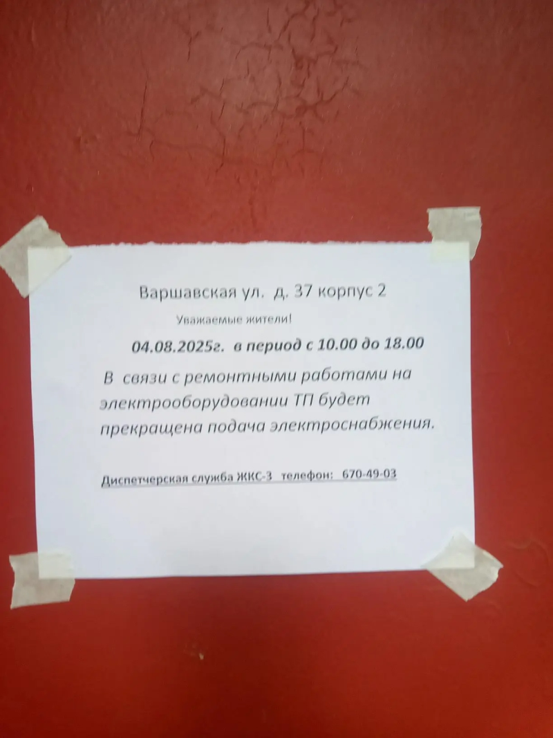 Информирование собственников о прекращении подачи электроэнергии в связи с проведением ремонтных работ с 10:00 до 18:00 04.08.2025 г. по адресу: Варшавская улица, д. 37, к. 2