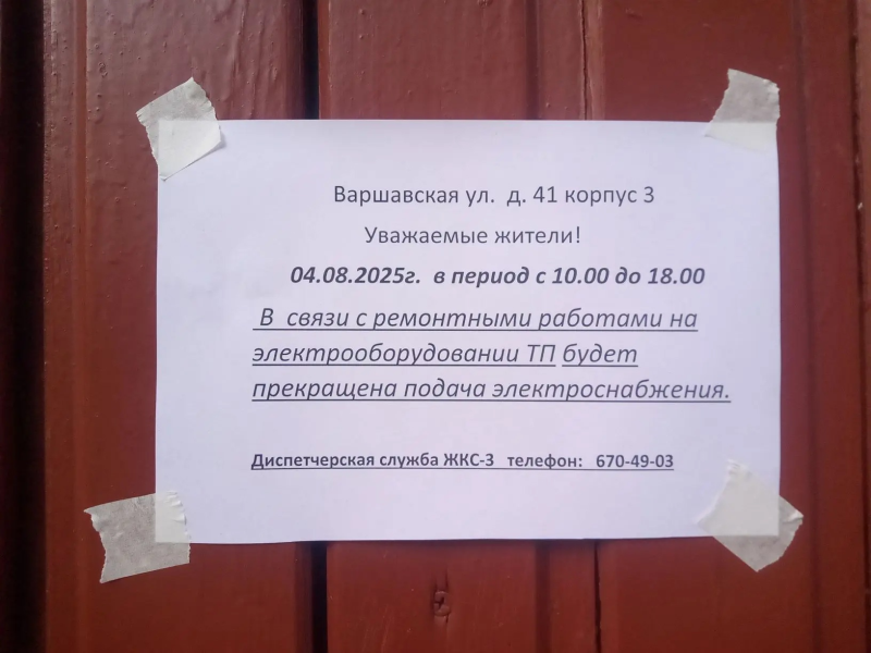Информирование собственников о прекращении подачи электроэнергии в связи с проведением ремонтных работ с 10:00 до 18:00 04.08.2025 г. по адресу: Варшавская улица, д. 41, к. 3
