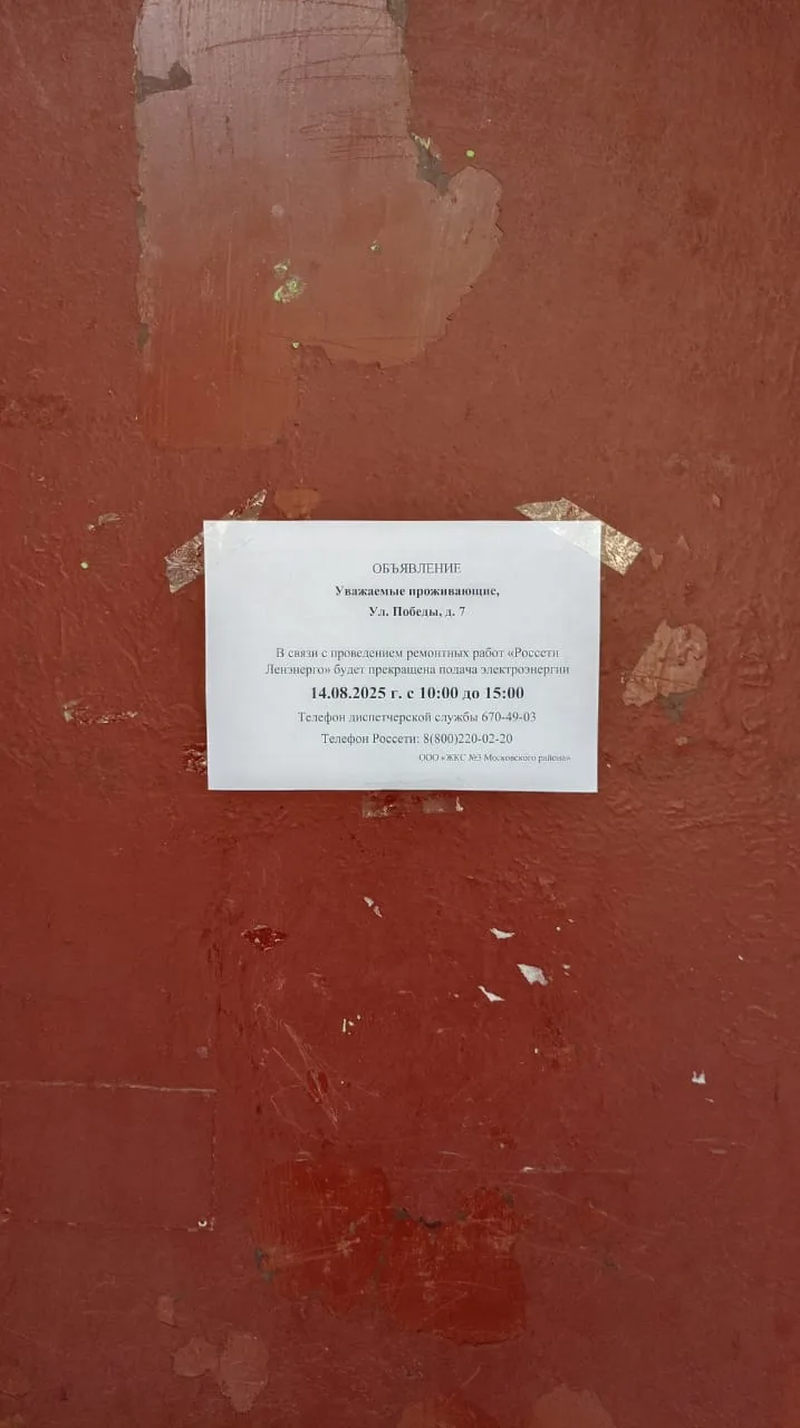 Информирование собственников об отключении электроэнергии в связи с проведением ремонтных работ "Россети Ленэнерго" 10:00 до 15:00 14.08.2025 г. по адресу: улица Победы, д. 7