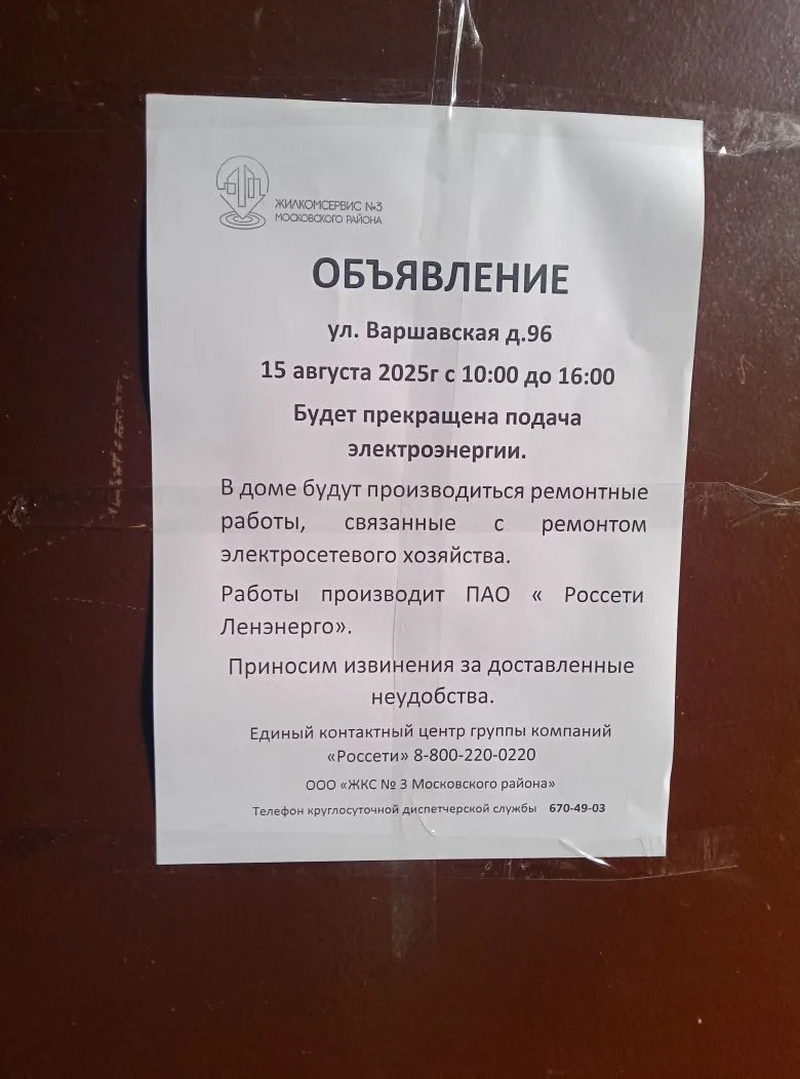 Информирование собственников о прекращении подачи электроэнергии в связи с ремонтными работами ПАО "Россети Ленэнерго" с 10:00 до 16:00 15.08.2025 г. по адресу: Варшавская улица, д. 96