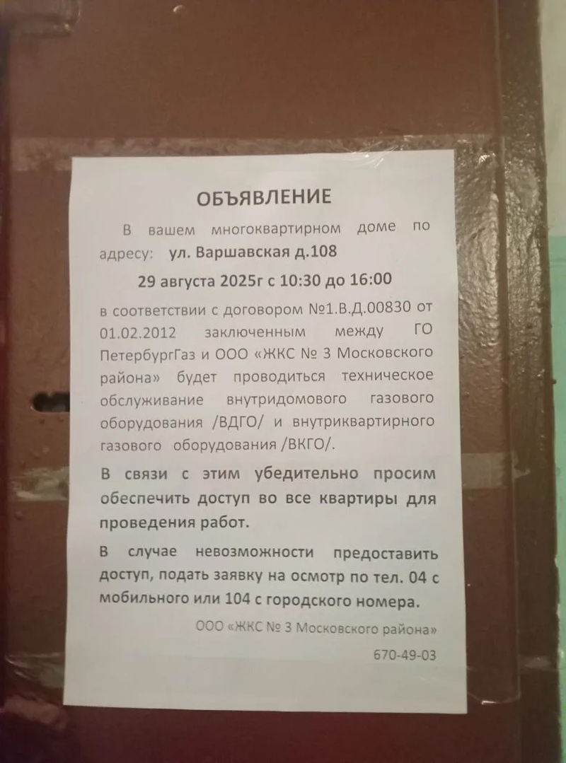 Информирование собственников о необходимости предоставления доступа для проверки внутриквартирного газового оборудования представителям ООО "ПетербургГаз" с 10:30 до 16:00 29.08.2025 г. по адресу: Варшавская улица, д. 108