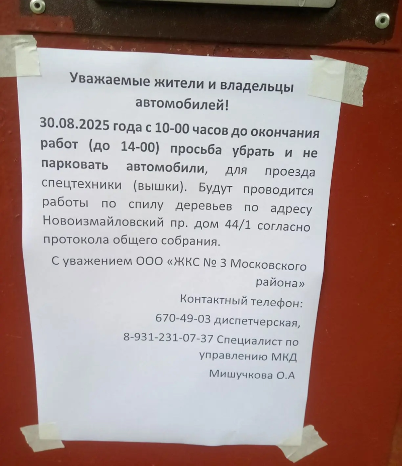 Информирование собственников о спиле деревьев с 10:00 30.08.2025 г. по адресу: Новоизмайловский проспект, д. 44, к. 1