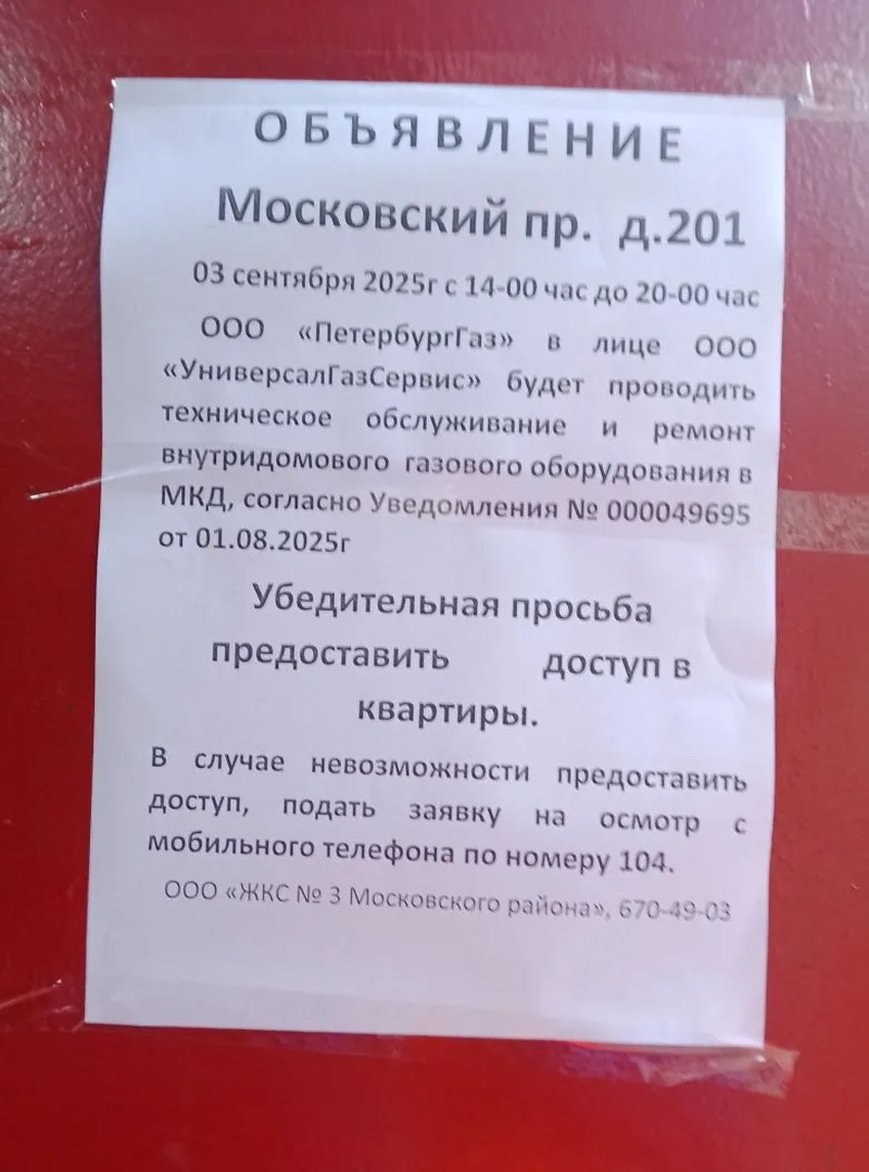 Информирование собственников о необходимости предоставления доступа для проверки внутриквартирного газового оборудования представителям ООО "ПетербургГаз" с 14:00 до 20:00 03.09.2025 г. по адресу: Московский проспект, д. 201