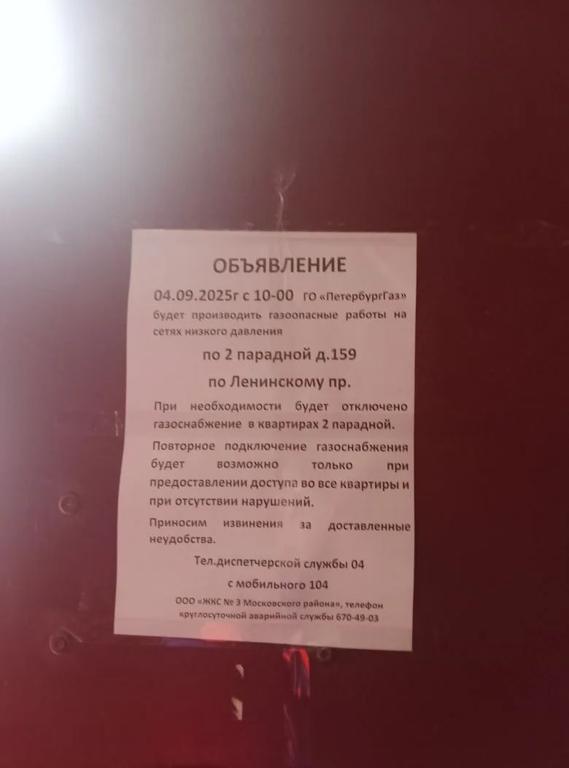 Информирование собственников о проведении газоопасных работ с 10:00 04.06.2025 г. ГРО "ПетербургГаз" по адресу: Ленинский проспект, д. 159, парадная №2