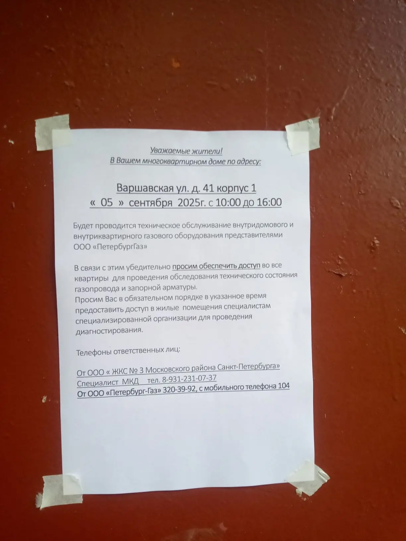 Информирование собственников о необходимости предоставления доступа для проверки внутриквартирного газового оборудования представителям ООО "ПетербургГаз" с 10:00 до 16:00 05.09.2025 г. по адресу: Варшавская улица, д. 41, к. 1