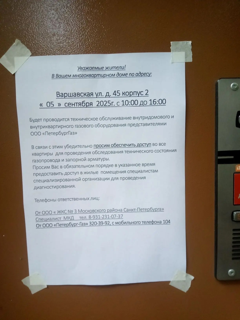 Информирование собственников о необходимости предоставления доступа для проверки внутриквартирного газового оборудования представителям ООО "ПетербургГаз" с 10:00 до 16:00 05.09.2025 г. по адресу: Варшавская улица, д. 45, к. 2