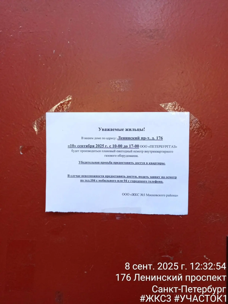 Информирование собственников о необходимости предоставления доступа для проверки внутриквартирного газового оборудования представителям ООО "ПетербургГаз" с 10:00 до 17:00 10.09.2025 г. по адресу: Ленинский проспект, д. 176