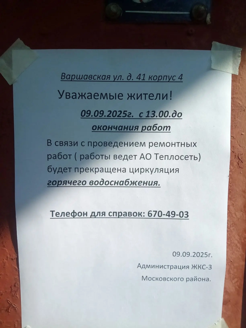 Информирование собственников о прекращении циркуляции ГВС с 13:00 09.09.2025 г. в связи с ремонтными работами АО «Теплосеть Санкт-Петербурга» по адресу: Варшавская улица, д. 41, к. 4
