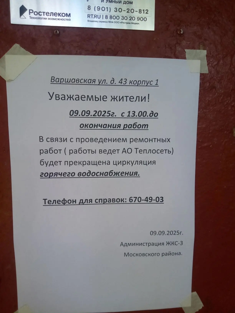 Информирование собственников о прекращении циркуляции ГВС с 13:00 09.09.2025 г. в связи с ремонтными работами АО «Теплосеть Санкт-Петербурга» по адресу: Варшавская улица, д. 43, к. 1