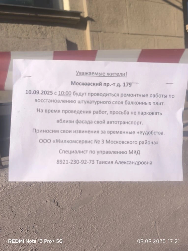 Информирование собственников о проведении ремонтных работ по восстановлению штукатурного слоя балконных плит с 10:00 10.09.2025 г. по адресу: Московский проспект, д. 179