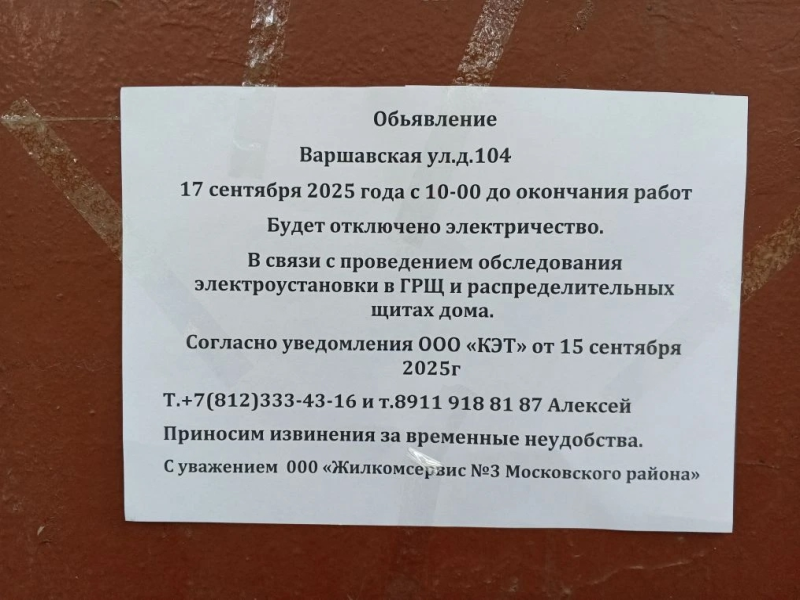 Информирование собственников о прекращении подачи электроэнергии с 10:00 17.09.20025 г. в связи с обследованием электроустановок в ГРЩ и распределительных щитах многоквартирного дома по адресу: Варшавская улица, д. 104
