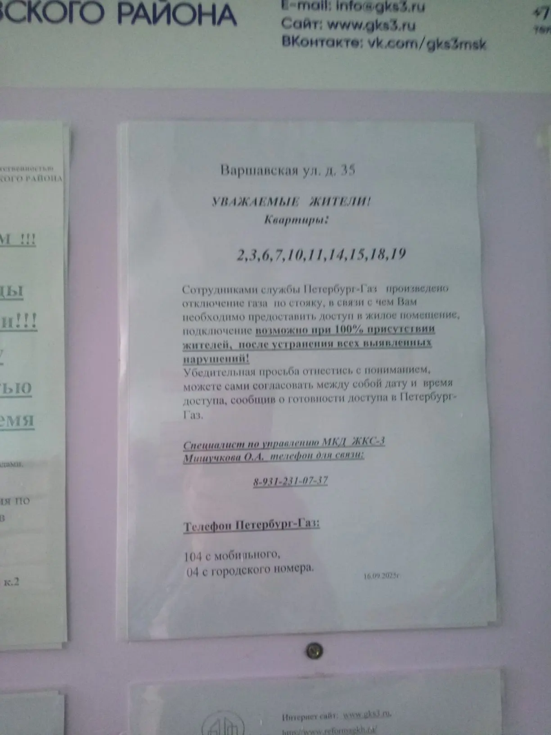 Информирование собственников о необходимости согласования даты для предоставления доступа в квартиру и возобновления подачи газа по адресу: Варшавская улица, д. 35, квартиры 2, 3,6,7,10,11,14,15,18,19