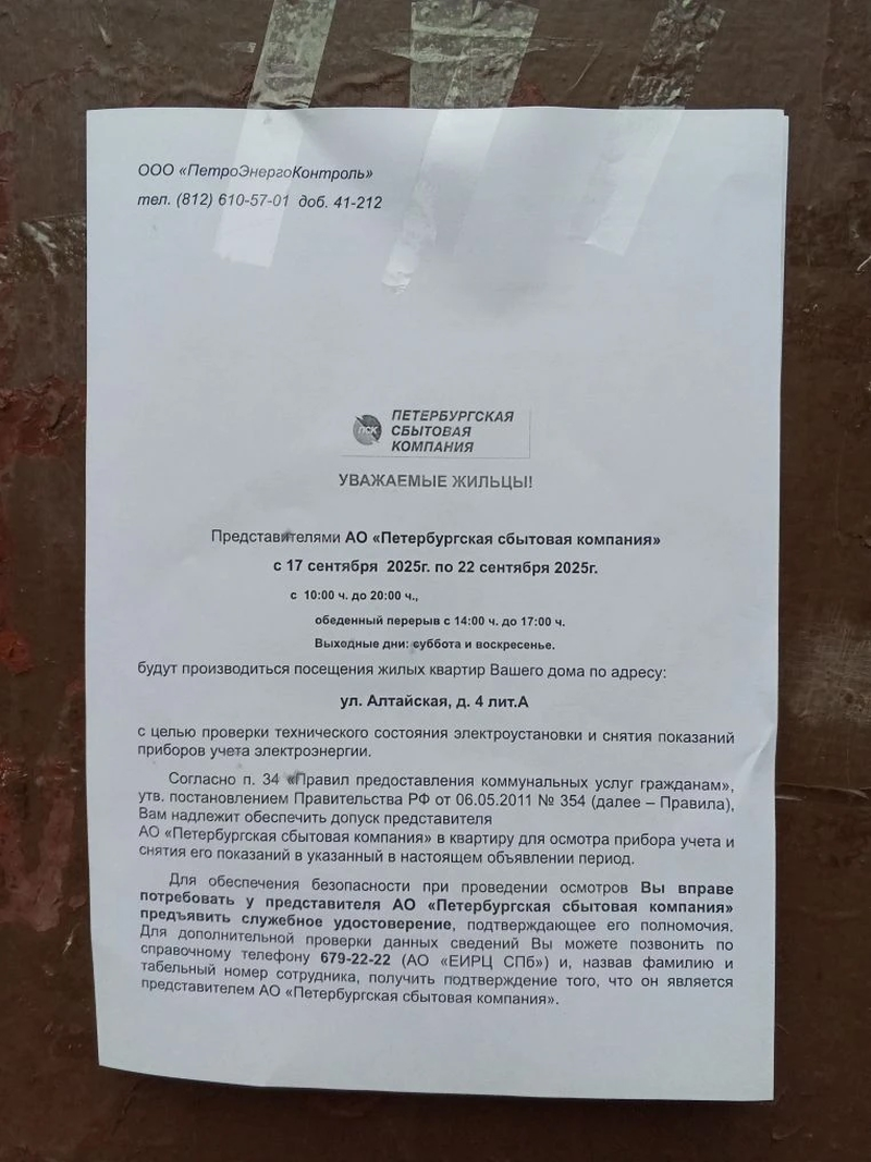 Информирование собственников о необходимости предоставления доступа в квартиры для проверки показаний приборов учёта электроэнергии представителями АО "Петербургская сбытовая компания" с 10:00 до 20:00 с 17.09.2025 г. по 22.09.2025 г. по адресу: Алтайская улица, д. 4
