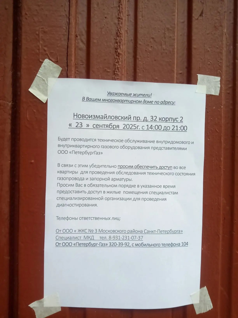 Информирование собственников о необходимости предоставления доступа для проверки внутриквартирного газового оборудования представителям ООО "ПетербургГаз" с 14:00 до 21:00 23.09.2025 г. по адресу: Новоизмайловский проспект, д. 32, к. 2