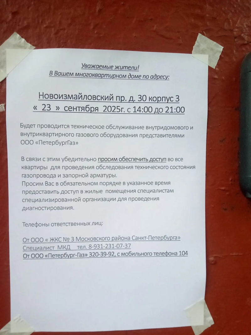 Информирование собственников о необходимости предоставления доступа для проверки внутриквартирного газового оборудования представителям ООО "ПетербургГаз" с 14:00 до 21:00 23.09.2025 г. по адресу: Новоизмайловский проспект, д. 32, к. 3