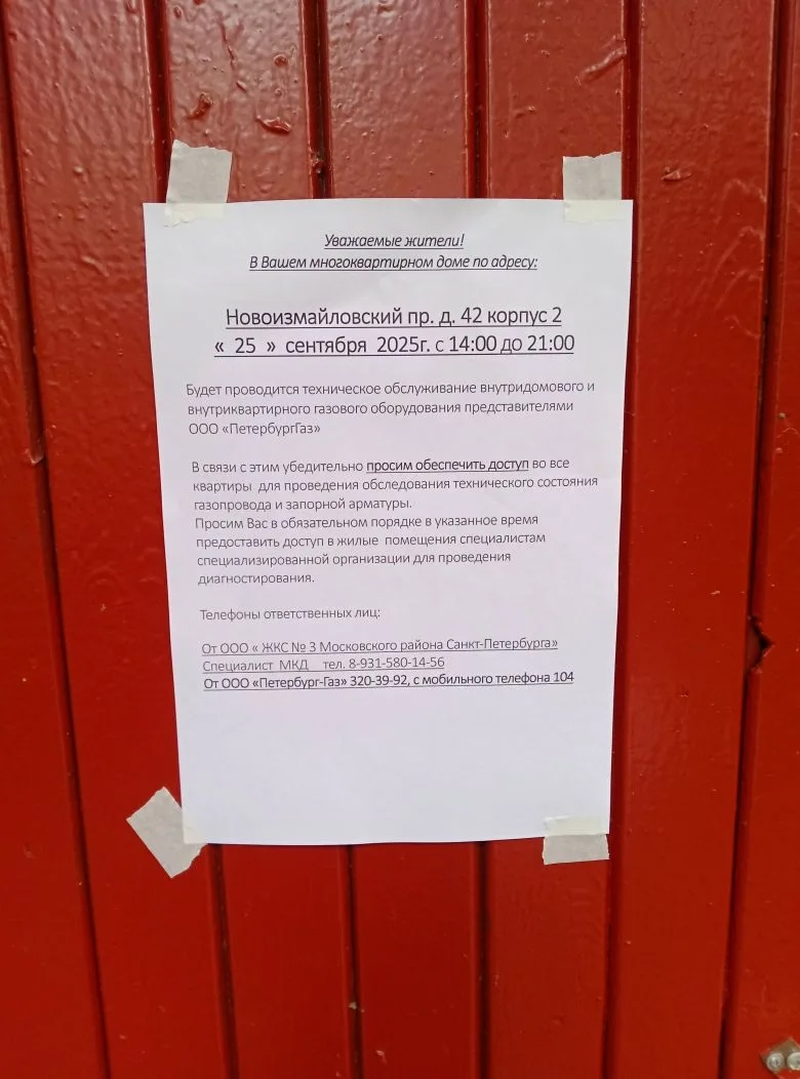 Информирование собственников о необходимости предоставления доступа для проверки внутриквартирного газового оборудования представителям ООО "ПетербургГаз" с 14:00 до 21:00 25.09.2025 г. по адресу: Новоизмайловский проспект, д. 42, к. 2