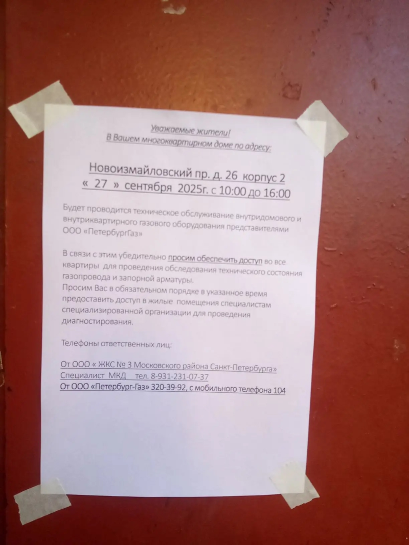Информирование собственников о необходимости предоставления доступа для проверки внутриквартирного газового оборудования представителям ООО "ПетербургГаз" с 10:00 до 16:00 27.09.2025 г. по адресу: Новоизмайловский проспект, д. 26 к. 2
