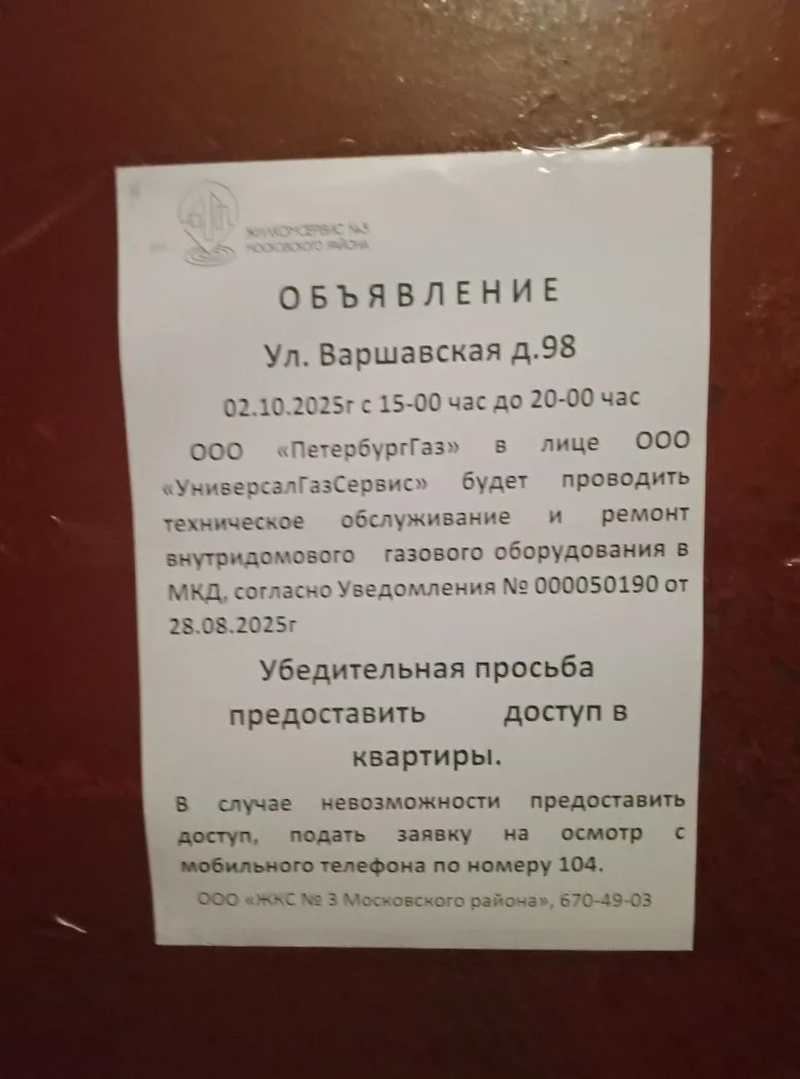 Информирование собственников о необходимости предоставления доступа для проверки внутриквартирного газового оборудования представителям ООО "ПетербургГаз" с 15:00 до 20:00 01.10.2025 г. по адресу: Варшавская улица, д. 98