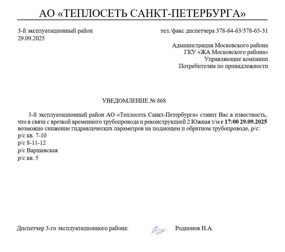 3-й эксплуатационный район АО «Теплосеть Санкт-Петербурга» ставит Вас в известность, что в связи с врезкой временного трубопровода и реконструкцией 2 Южная т/м с 17:00 29.09.2025 возможно снижение гидравлических параметров на подающем и обратном трубопроводе по р/с кварталам: