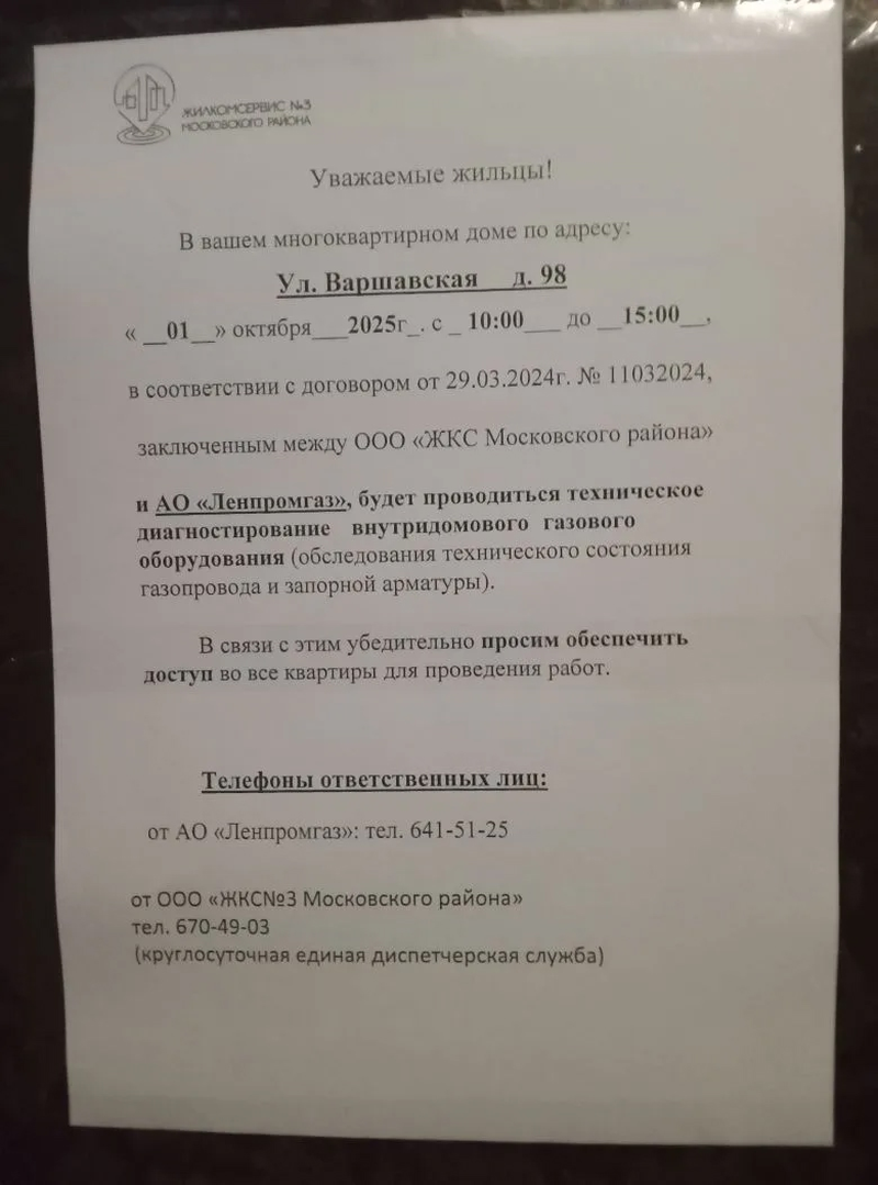 Информирование собственников о необходимости предоставления доступа для проверки внутриквартирного газового оборудования представителям ООО "ПетербургГаз" с 10:00 до 15:00 01.10.2025 г. по адресу: Варшавская улица, д. 98