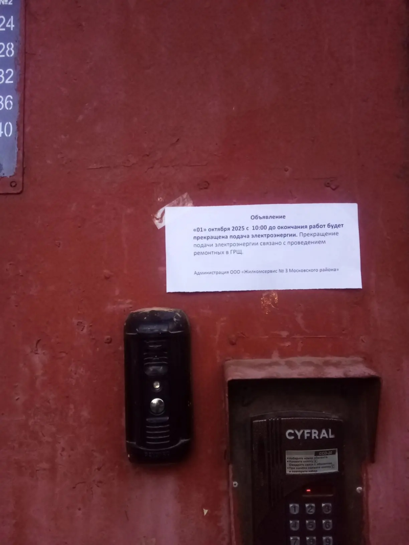 Информирование собственников об отключении подачи электроэнергии с 10:00 до окончания работ 01.10.2025 г. по адресам: Краснопутиловская улица, д. 58, д. 68, д. 62, д. 93