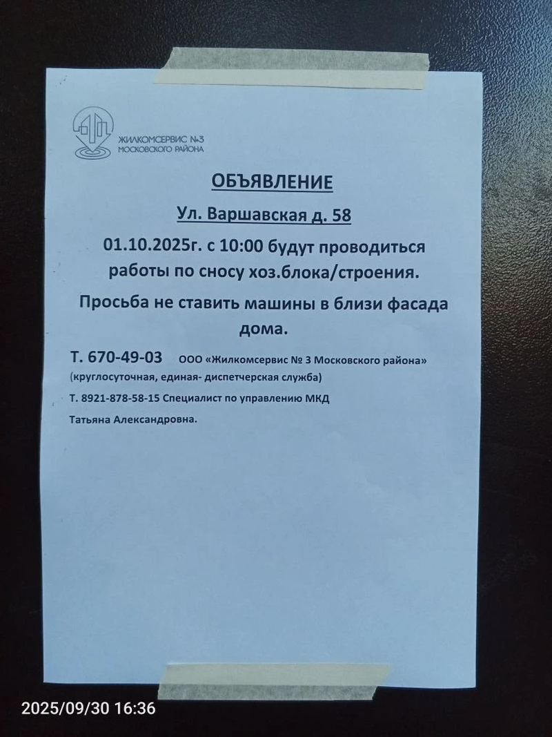 Информирование собственников о сносе хоз.блока с 10:00 01.10.2025 г. по адресу: Варшавская улица, д. 58